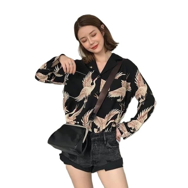 デザイン:ベージュトーンのエレガントな鶴鳥柄が特徴のスタイリッシュなブラックシャツ。クラシックな襟付きネックラインと長袖が特徴です。